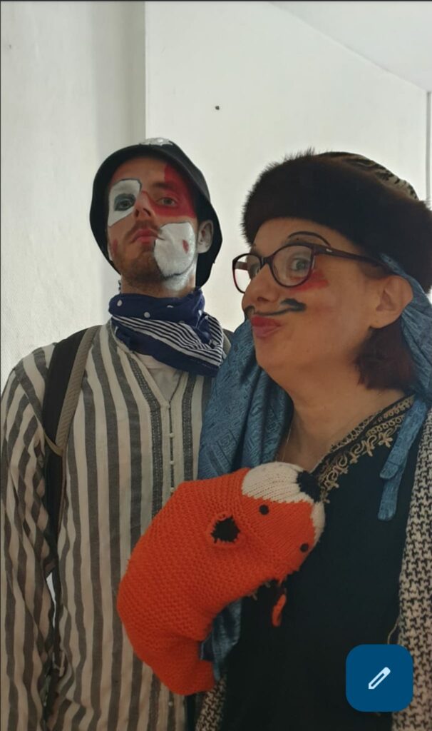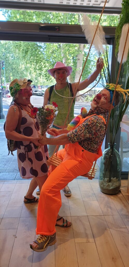 Nous sommes un groupe à géométrie mouvante de clown.e.s qui aimons nous promener en ville pour jouer librement entre nous, avec les gens, avec les objets, pour nous amuser, amener un souffle de folie joyeuse, passer du bon temps ensemble et voir du pays.
